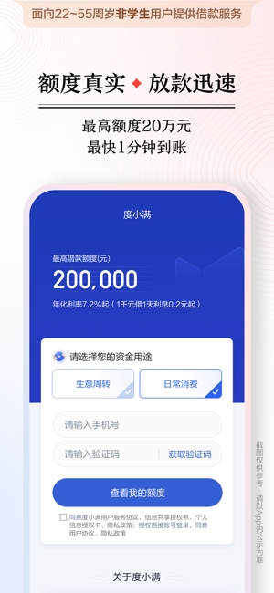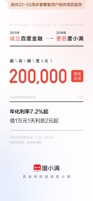度小满金融提供互联网信贷服务、优质的基金销售服务和安心的保险服务,严格筛选金融产品,提供多重保障服务,确保用户资金安全。用户可通过手机在线申请,享受便捷的金融服务体验。