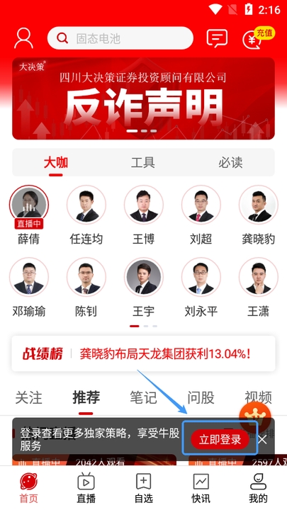 大决策是由四川大决策证券投资顾问有限公司开发的一款专业证券投资咨询应用,以客户需求为导向,构建了资讯、研究、投顾及投资的一站式服务体系。功能包括交易日全天候的投顾直播、60秒语音即时解答个股问题的问股服务、投资笔记功能以及丰富的视频课程和散户训练营。还提供实时行情和数据分析,帮助用户及时把握市场动态,做出明智的投资决策。