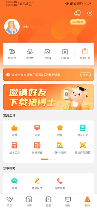 4、最后来到我的页面,在这里可以查看相应的订单信息,还拥有养猪算盘、学习记录、客服等常用的工具选项。