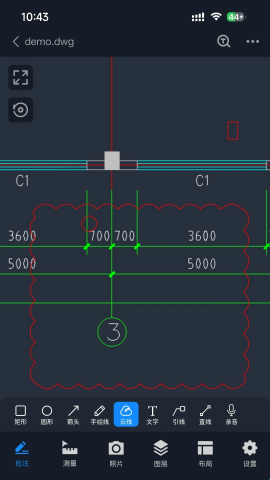 支持对长度、角度、弧长、半径、坐标、周长和面积进行测量标注,支持云线、自由线、文字、照片、语音等批注功能。