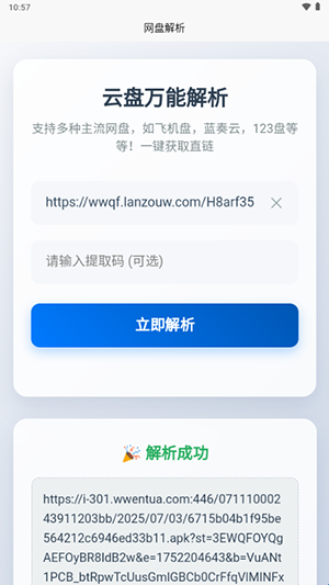 123网盘解析原名网盘解析,当用户需要下载某些资源时,需要在各种搜索引擎或者资源网站中不停地查找,而且还需要进行一系列繁琐的操作。使用123云盘解析工具,用户只需要在相关网站上找到资源链接,将其复制到123云盘解析工具中进行解析,就可以获得简单、直接的下载链接,需要的用户快来下载吧。