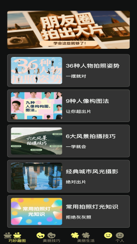 4、翻看诸多拍照技巧,自由学习拍照方式方法,掌握更多出片的拍摄手法;