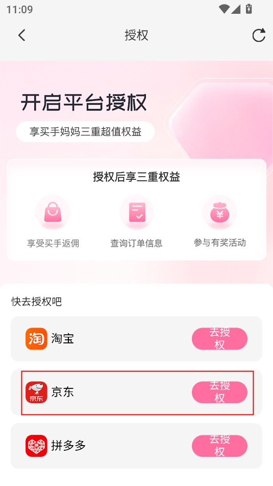 3、来到授权页面,再点击京东选项右侧的“去授权”按钮,根据页面提示填写相关信息即可授权成功。