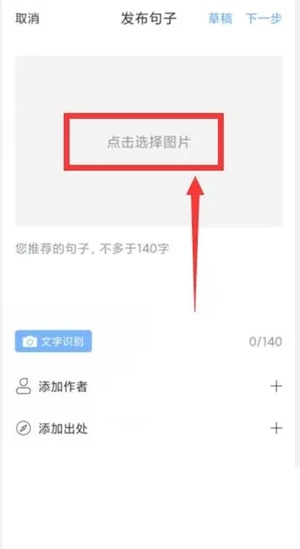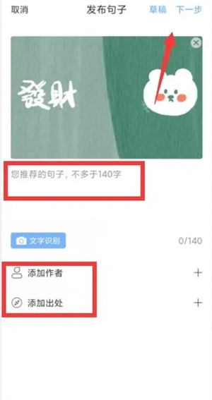 3、再输入句子,添加作者及添加出处,再点击右上角的【下一步】。(如图所示)