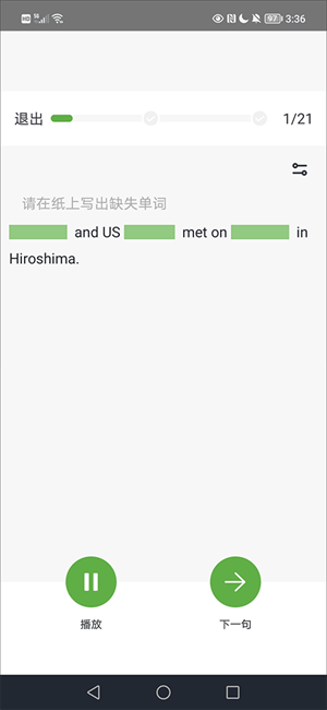 在听力练习时,常出现这样的状况:边听边写时,书写速度跟不上,往往一段听力结束了,我还没写完,导致中间很多内容没听到就被忽略了。针对此问题,我建议下载一款复读软件,其使用效果与平常的复读机无异。听一句话或者8 - 9个单词后,就能让软件复读,如此一来,在复读过程中,就能够从容地把听到的单词写下来,心里也不会感到过于急促,进而不知所措了。