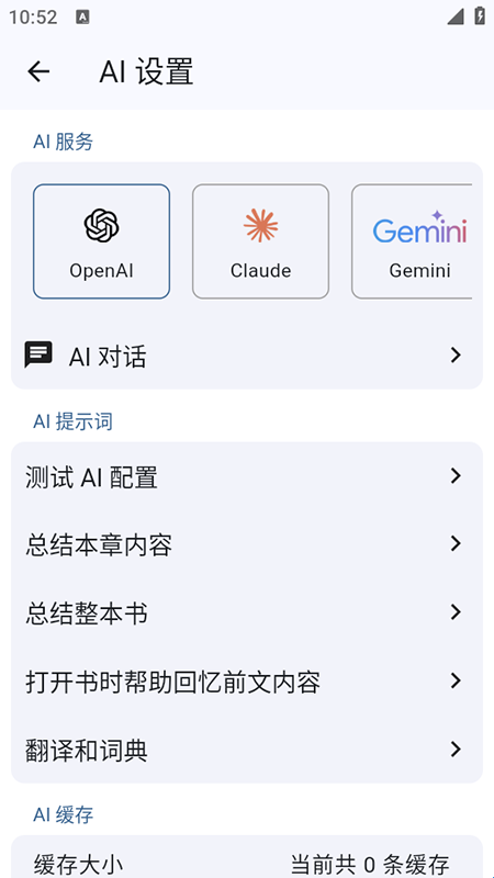 3、在“设置→AI”中选择AI服务提供商,输入API密钥,即可使用摘要、分析、问答等功能。