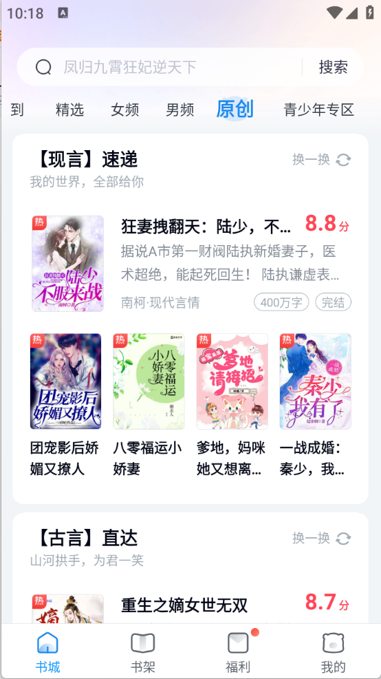 2、“书城”页面,为用户提供了超级多的小说资源,包含男频、女频以及原创等类型。