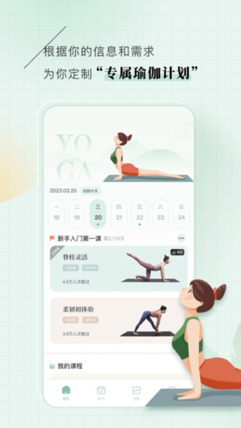 1、专属计划制订:通过收集你基本信息和瑜伽目标从而为你量身打造一套瑜伽练习计划,在你完成本次计划后生成计划报告。