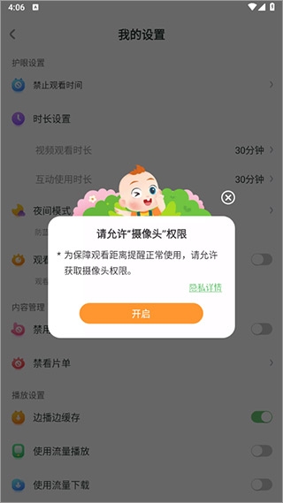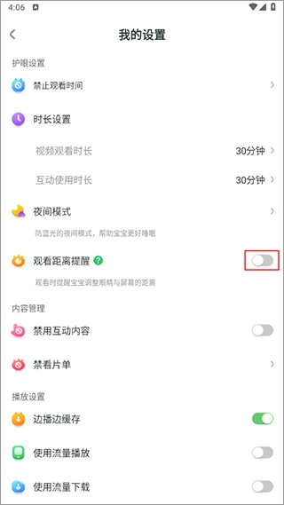 3、在我的设置的界面上找到观看距离提醒点击开启;