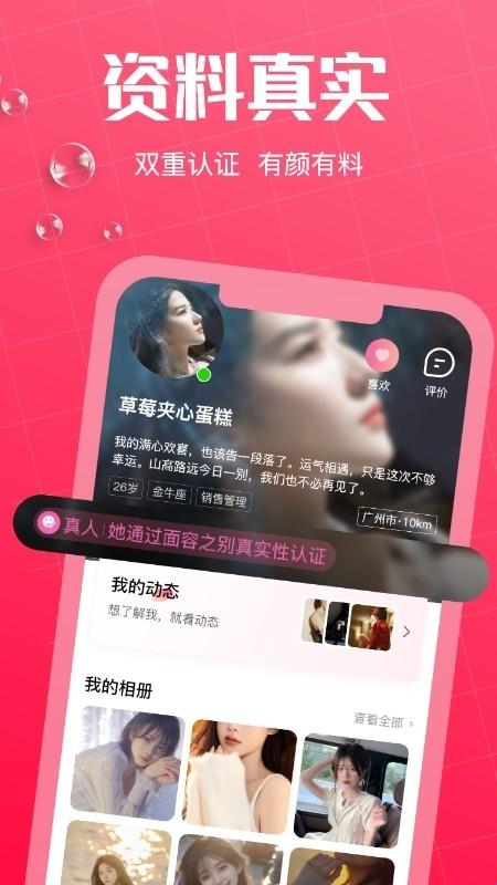 4、真实认证:自拍认证、语音认证、视频认证,查看同城附近妹子资料,即时聊天,在线处cp。