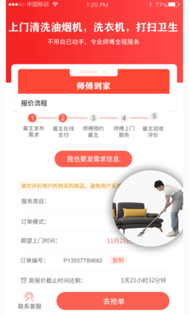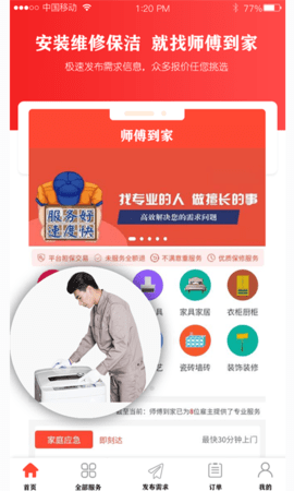 师傅到家app是一家互联网科技生活服务商城,提供全国同城生活到家服务,涵盖上门安装/上门维修/上门清洗/上门保洁/搬家拉货等综合性同城到家服务。用户一健下单,多位师傅竞标报价,用户轻松挑选师傅中标,满足了全国用户的业务需求。