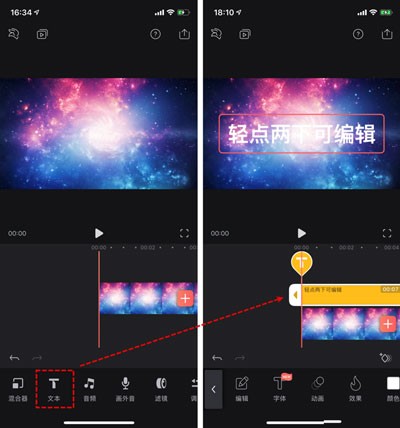 我们在主工具栏点击文本工具,就可以添加一层字幕的导轨。双击字幕层就可以输入我们想要的文字。颜色和字体样式,都是基本操作。但是不支持屏幕取色。