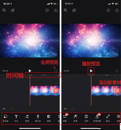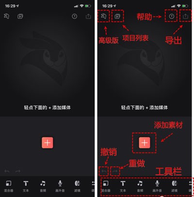 新建项目后,我们就可以在编辑状态的主页面按加号来从手机内添加素材到项目。图里也介绍下主界面的一些基本功能。