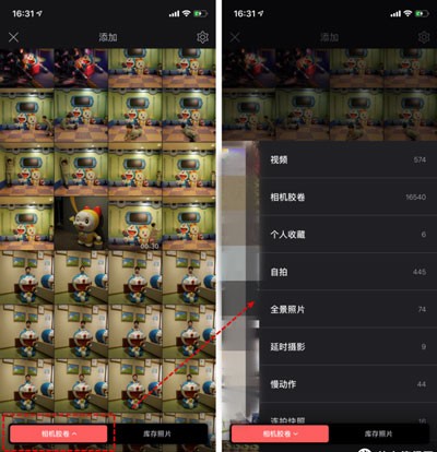 3、点击添加素材的加号后,系统会显示你手机内的相册,你也可以点击左下角的相机胶卷来选择你手机内不同的相册,比如照片,视频,实况照片等。