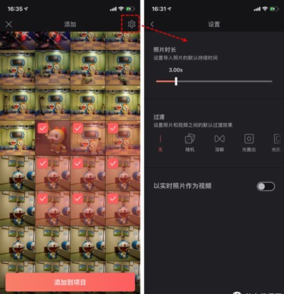 你可以一次性的选择多张照片或者视频一起添加进项目。通过右上角的设置按钮,你可以进行如下的设置