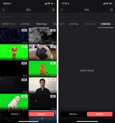 软件自己也提供了少量视频素材,并没有提供照片。