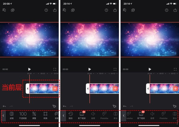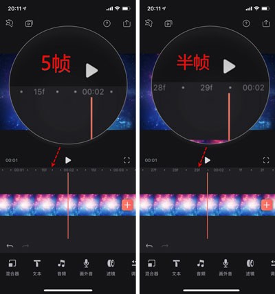 在开始剪切分割视频前,我们先来熟悉一个操作,通过两个手指在界面上向外或者向内滑动对视频进行时间轴的缩放,这也是视频剪辑比较重要的操作,我们可以精确的控制到我们需要的时间轴精度来对视频进行操作。