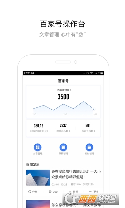 创作者发布的内容将被分发到百度app、百度好看等,并被百度搜索收录。 百家号App让创作者能在手机上便捷的管理和发布文章、图集、视频等内容,查看内容和收入数据,以及实时接收官方公告和消息。