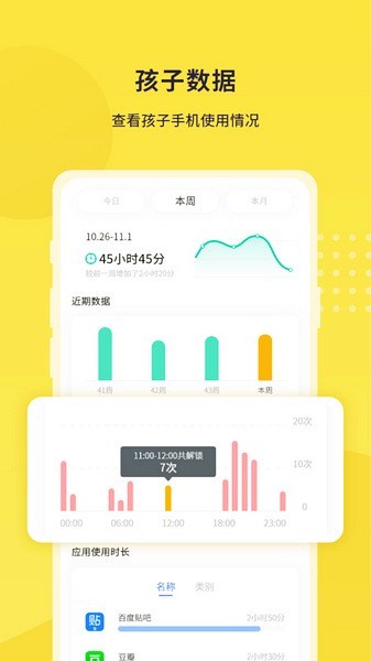 1、实时统计孩子使用设备动态,多维度的统计数据。