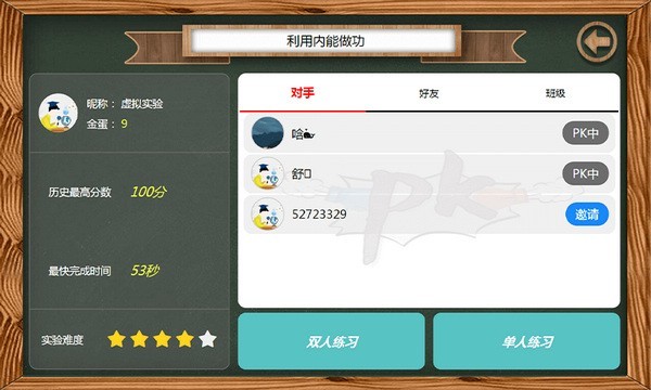各实验可以单人练习,也可以邀请好友PK,比熟练度,兑礼品