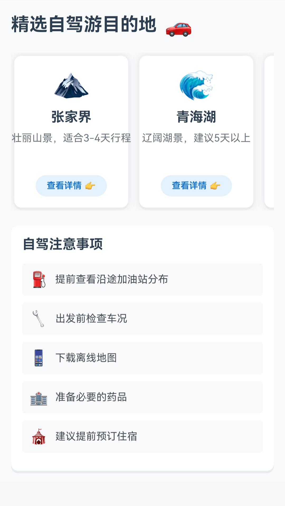 【自驾游规划的精选自驾游目的地】:推荐了如张家界、青海湖等自驾游胜地,并提供了行程建议和自驾注意事项;