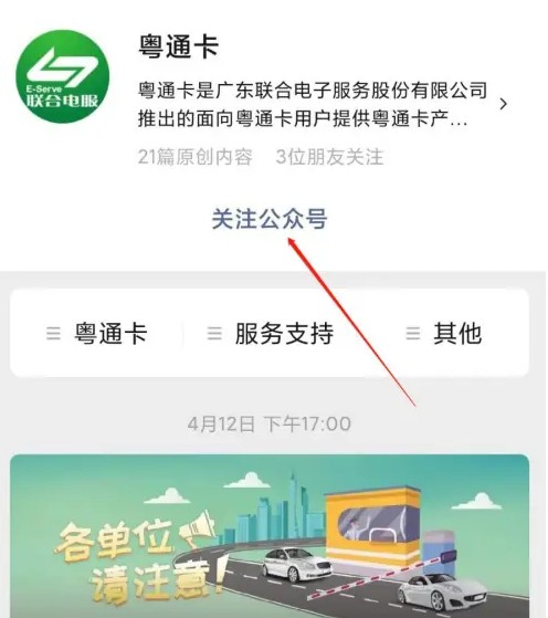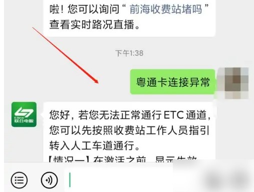 进入公众号聊天界面,在对话框中输入粤通卡连接异常进行查询