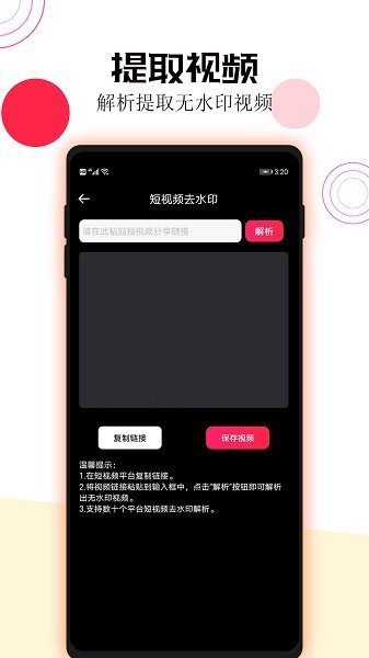 - 提取视频:复制短视频链接一键解析提取无水印视频。