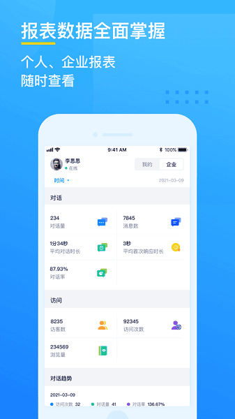 提供完整详细的顾客活动和对话信息,这些数据帮你找到客户服务的薄弱点,更有针对性的去解决问题,进而提高服务质量。还能为你统计客服的工作强度,以及工作成果,帮你客观的评价团队工作绩效。