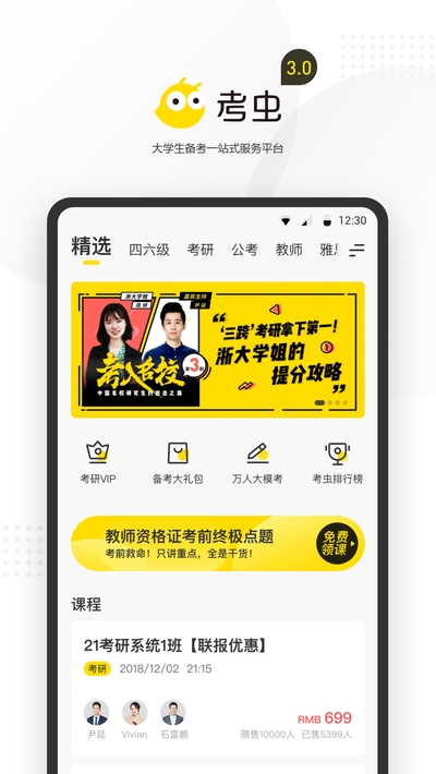 考虫英语app是一款英语在线学习软件,手机在线直播课程,专门为准备考四六级、考研以及雅思考试的同学准备的,提供完整的四六级、考研英语、雅思直播课程、配套资料、在线模拟考试随堂测试和能力评估报告等考试学习解决方案。欢迎下载使用!