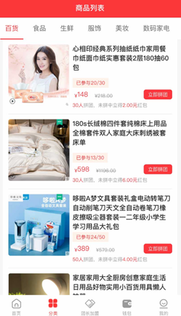 3,平台建立了非常全面的商品分类,所有的商品都导入了齐全的拼团管理模式,包括日用百货以及生鲜食品还有各种服饰美妆和数码家电等等,能够满足所有用户的购物需求。
