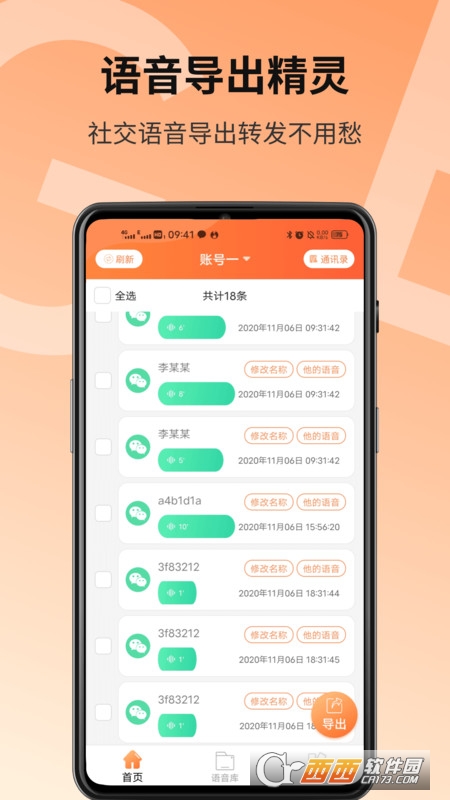 微信语音导出app导出过程中,微信里所有语音记录将显示出来,用户可以预览播放并一键筛选好友语音,根据需要选择多条语音合并成MP3文件,文件可以直接保存在手机或分享给好友!解决微信语音无法直接转发及分类管理的难题。