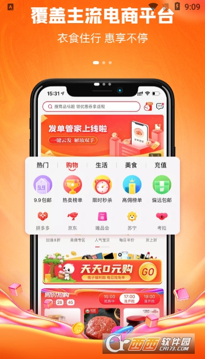 3、整合了淘宝、苏宁、考拉等主流电商平台,更有美团、携程、淘票票、一键加油、生活券、话费充值等各类生活优惠。
