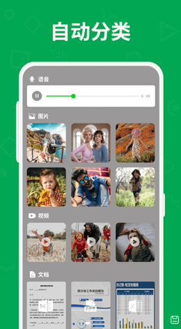 2,文件分类,清晰可见,用户可以在软件上看到所有的文件数据都进行了非常齐全的分类模式和管理,从基础的文件格式,图片还有语音以及视频等等,处理更轻松。