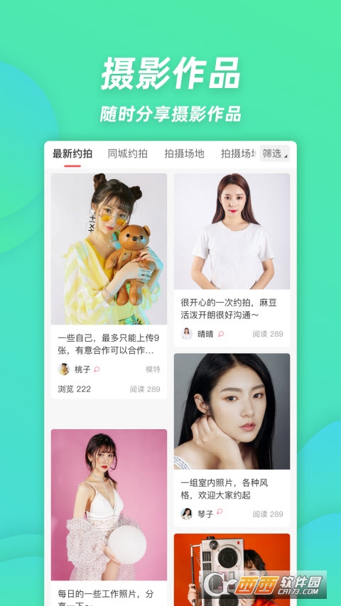 外景、淘宝、写真、旅拍四大约拍类型,找模特更方便。