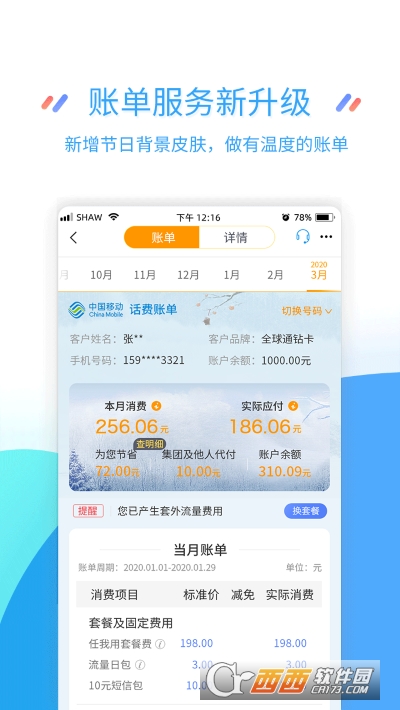 3、套餐余量新体验:超套费用提醒,成员共享全掌握
