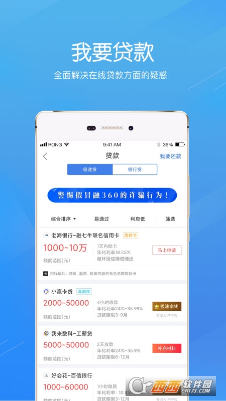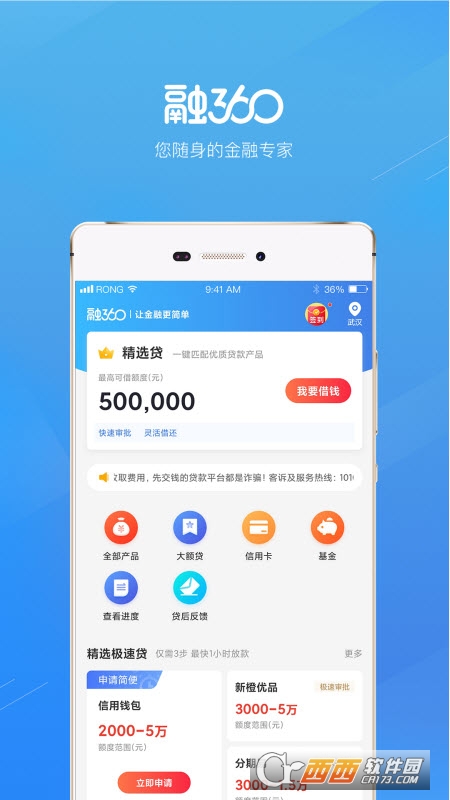 融360您随身的金融专家,中国排名第一的金融垂直搜索平台,为您提供全面、精准的金融服务,快速申请贷款、信用卡,购买理财产品,查询央行信用报告、附近银行等。融360(北京融世纪信息技术有限公司),“互联网+金融”典型业态,是新型的网络金融服务公司,利用大数据、搜索等技术,让上百家银行的金融产品可以直观地呈现在用户面前。