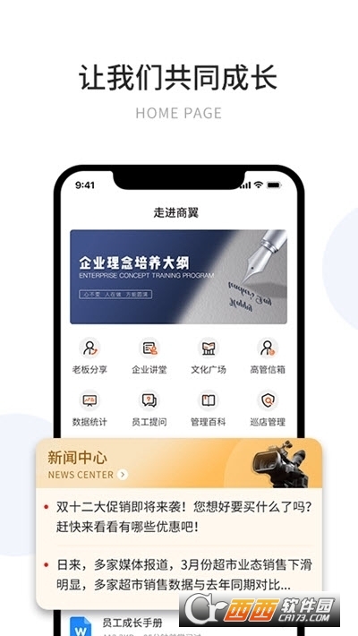 一起进步。软件上设置了非常全面的文化广场功能,通过各种不同的资讯分享来提高员工对于企业文化的认同感和团队感,更好的帮助员工产生强大的凝聚力