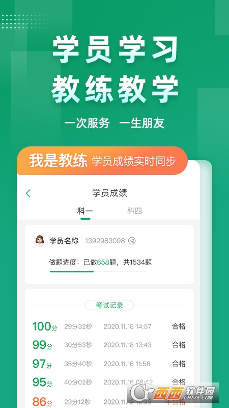 1、教练随时查看学员模式考试成绩,了解学员学习进度。