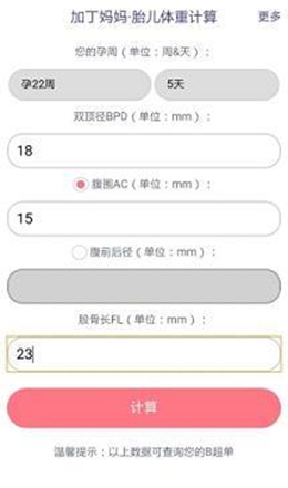 胎儿体重计算器app是一款依据本身非常庞大的计算和测算模式来进行开发和管理的优质工具软件,软件上导入了系统化的各种数据公式内容,让用户自己可以来测量自己肚子里面胎儿的活动情况以及不同类型的变化,使用起来更加轻松,可以随时记录自己肚子孩子的成长过程,让养育宝宝更加轻松。