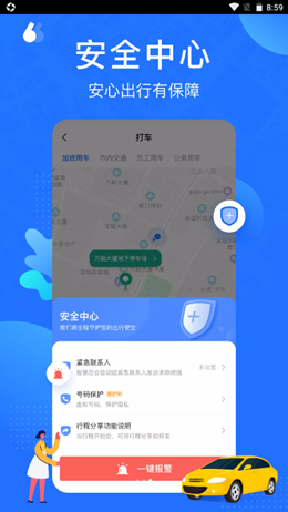3,同时软件上也建立了非常完善的自我保护机制,不仅可拥有立即拨打电话的紧急联系人模式,也有其他类型的行程分享和一键报警工农,让用户的出行更加安全。
