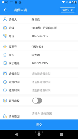 2,随时更新,学生动向,用户在使用软件的过程中,遇到的各种问题都可以通过软件来进行专业的和教师以及学校进行回复和沟通,所有需求都可以在线完成,请假更方便。