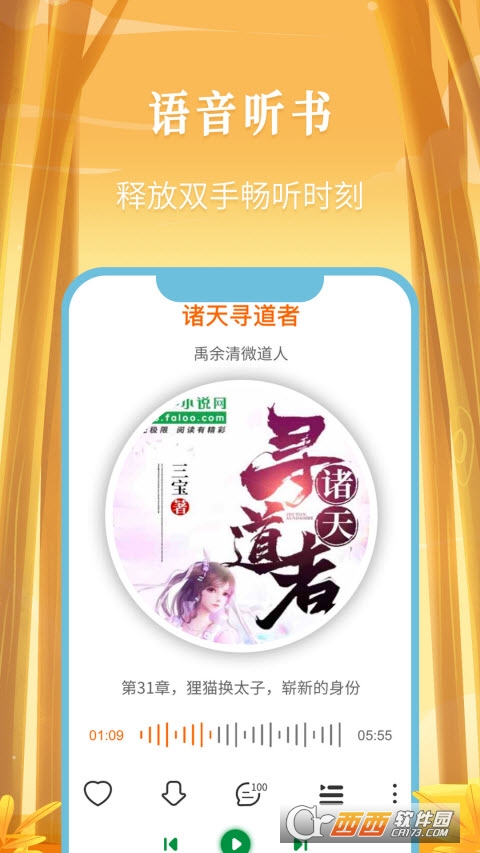 多屏划动,支持书架中书籍搜索,书架管理小说分类。仿真翻页效果,自定义背景字体,开灯关灯贴心模式。