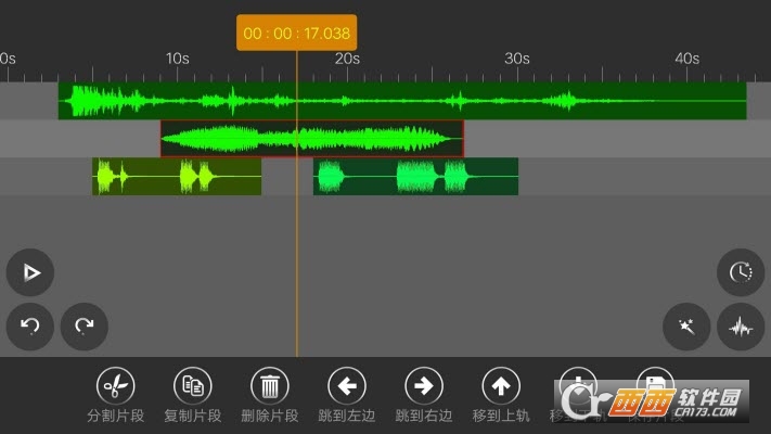 【复杂组合应用】wisae音频编辑器app 能做上面那些事情,肯定能通过组合以对付复杂使用场景。这一切无论是部分截取、修剪串接、复制重复、调节音量(可渐入渐出)、或是添加背景,所有相关的曲子片段都在同一个面板上排列,想怎么弄就怎么弄。