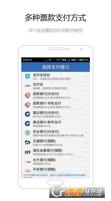 票款支付支持支付宝,不限任何银行。还可直接选择:建设银行、招商银行、农业银行、工商银行(仅限iPad)、交通银行、浦东发展银行、光大银行、平安银行、兴业银行、北京银行,您还可以尝试更多的银 联卡。iPad可以通过银联支持邮储银行、中国银行等180多家银行。