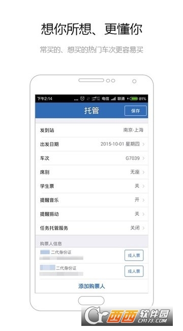 买火车票APP是一款通过直接连接中国铁路客户服务中心网站(12306.cn)来购买火车票的移动设备客户端工具软件。它可以让您随时随地锁定列车座位号,出门旅行时,不用再到火车站售票厅及火车票代售点排长长的购票队伍。该软件是互联网购买火车票的一个有力补充,彻底解决了手机浏览器(如iPhone、iPad和iPod touch的Safari等)不能在12306.cn安装证书、控件及输入困难等问题。