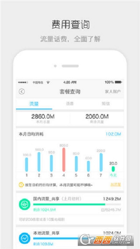 (二)统计全面性:可分类实时监测用户套餐剩余流量、本地流量、国内流量、共享以及定向流量、流量卡等流量信息,精准查询,还能及时掌握话费余额,确保您畅享网络;