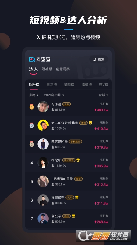 达人分析:包含粉丝榜、蓝V榜、被封达人榜、达人搜索,链接商家(品牌方)与达人搜索功能。商家通过数据分析与达人达成合作,降低市场调研成本,提高合作效率。