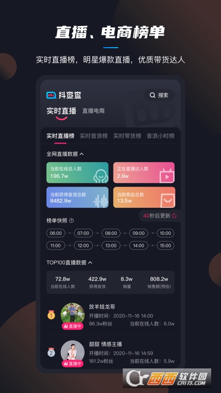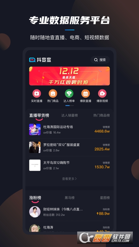 抖查查官网app为用户提供直播、电商、短视频、达人等多维度的榜单排名及数据分析,同时提供分钟级数据监测功能,时下热门的视频/音乐素材,帮助达人/电商团队/企业实现短视频和直播电商的商业变现,助您随时随地查直播、电商、短视频数据!
