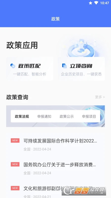 一款集国家政策、企业政策和项目申报于一体的的政策咨询服务平台App。发布全国各部门的产业扶持政策信息,帮助企业及时了解掌握国家及地方政策。