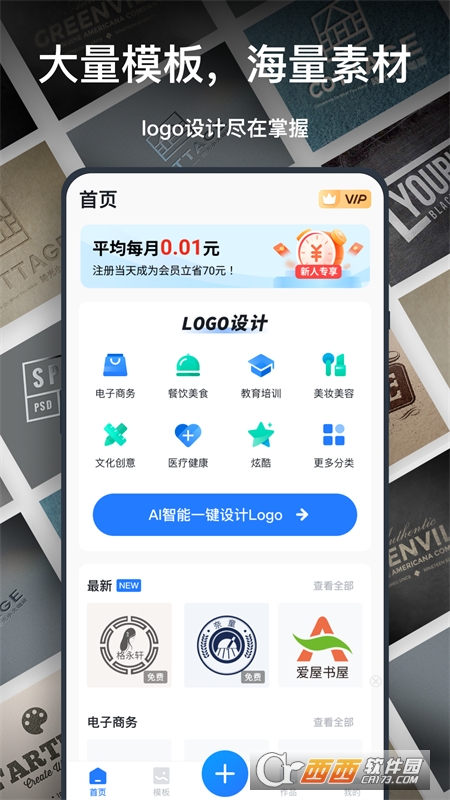 提供基础模板及时尚、简约、文字风等超多风格模板任你选,轻松绘制百变logo;